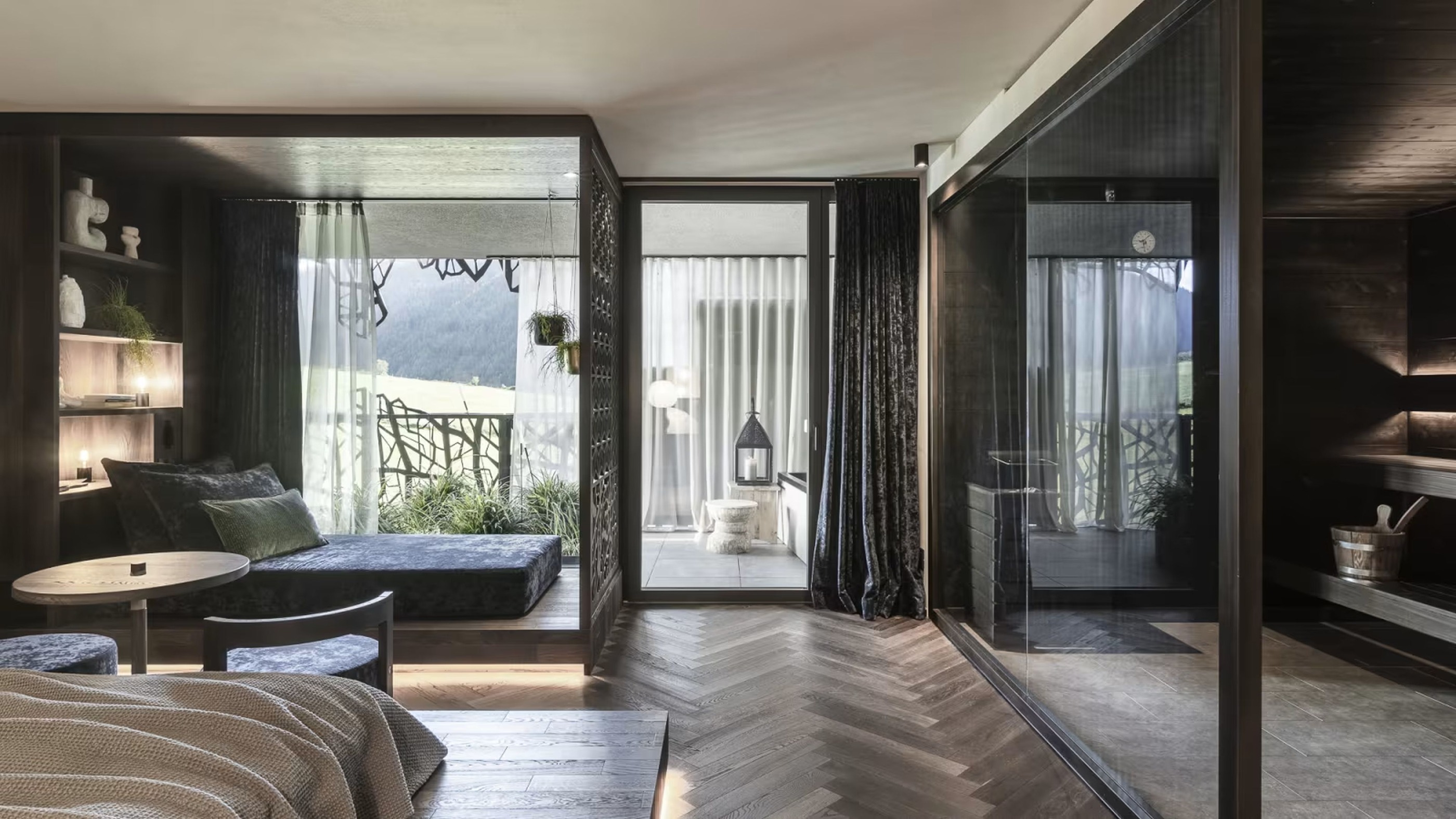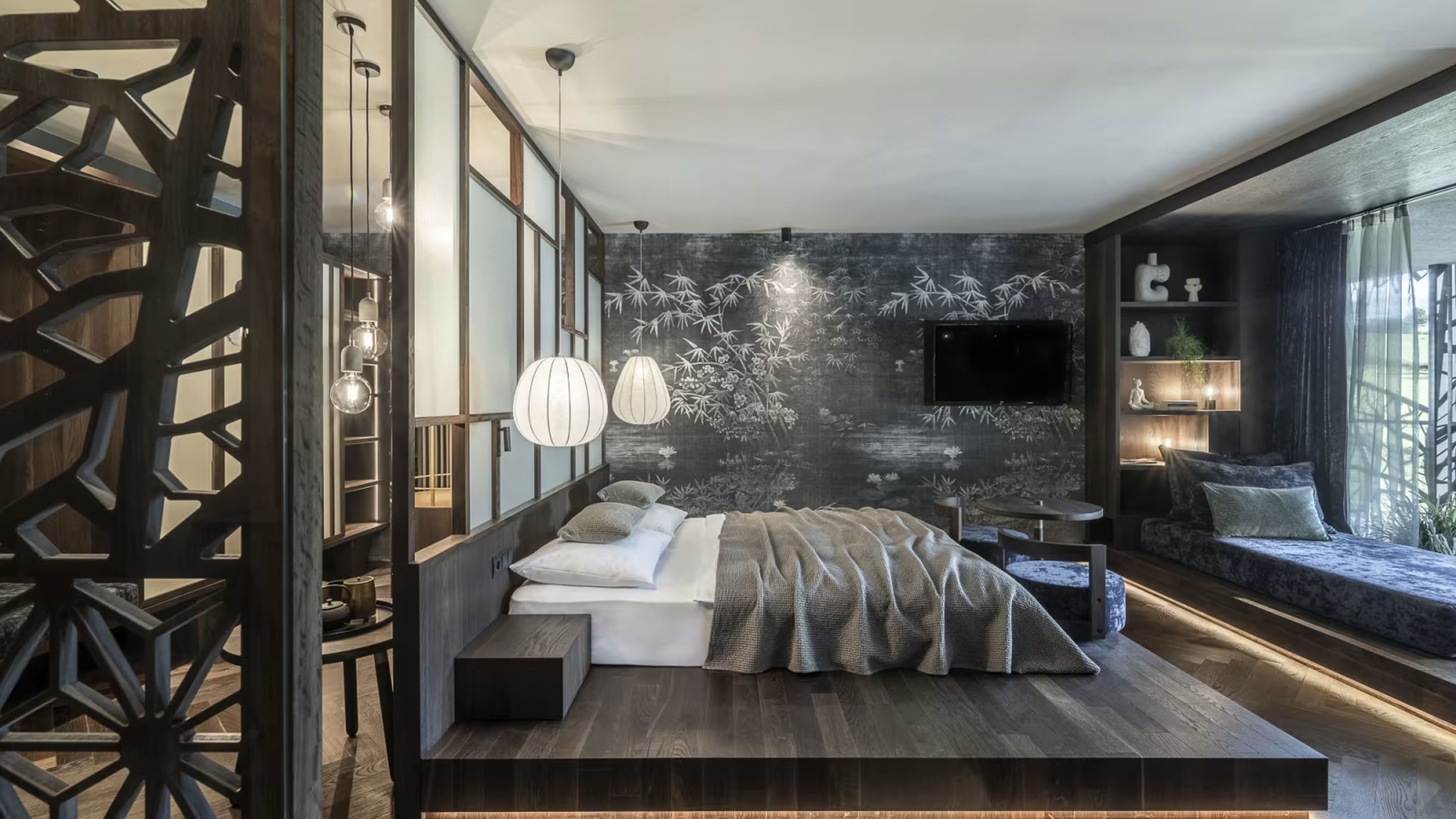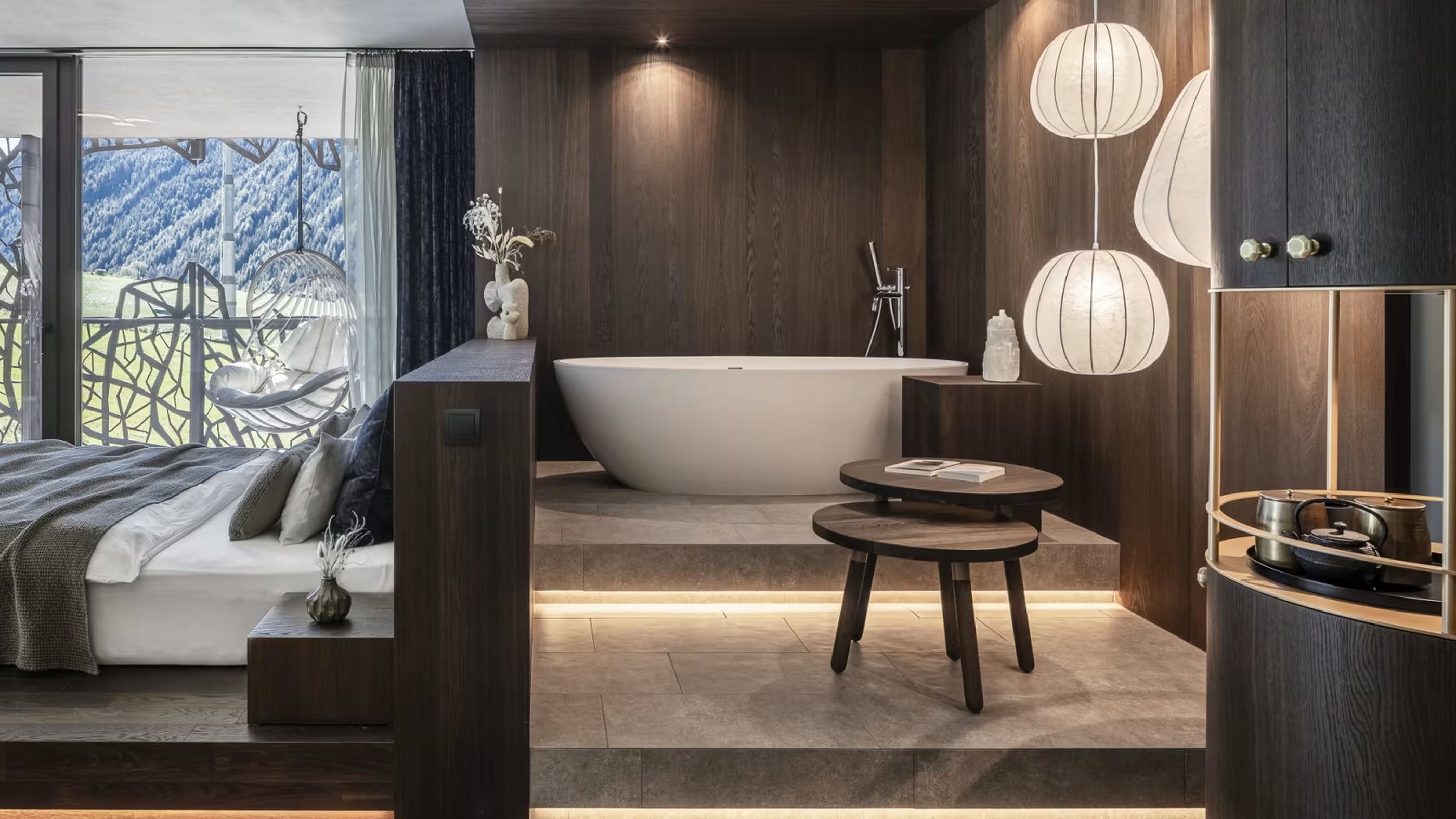 Design trifft auf Stille: Dunkle Hölzer, klare Linien, südostasiatische Elemente und alpine Akzente schaffen Räume voller Tiefe und Geborgenheit. Rückzugsorte, die inspirieren – innen wie außen.